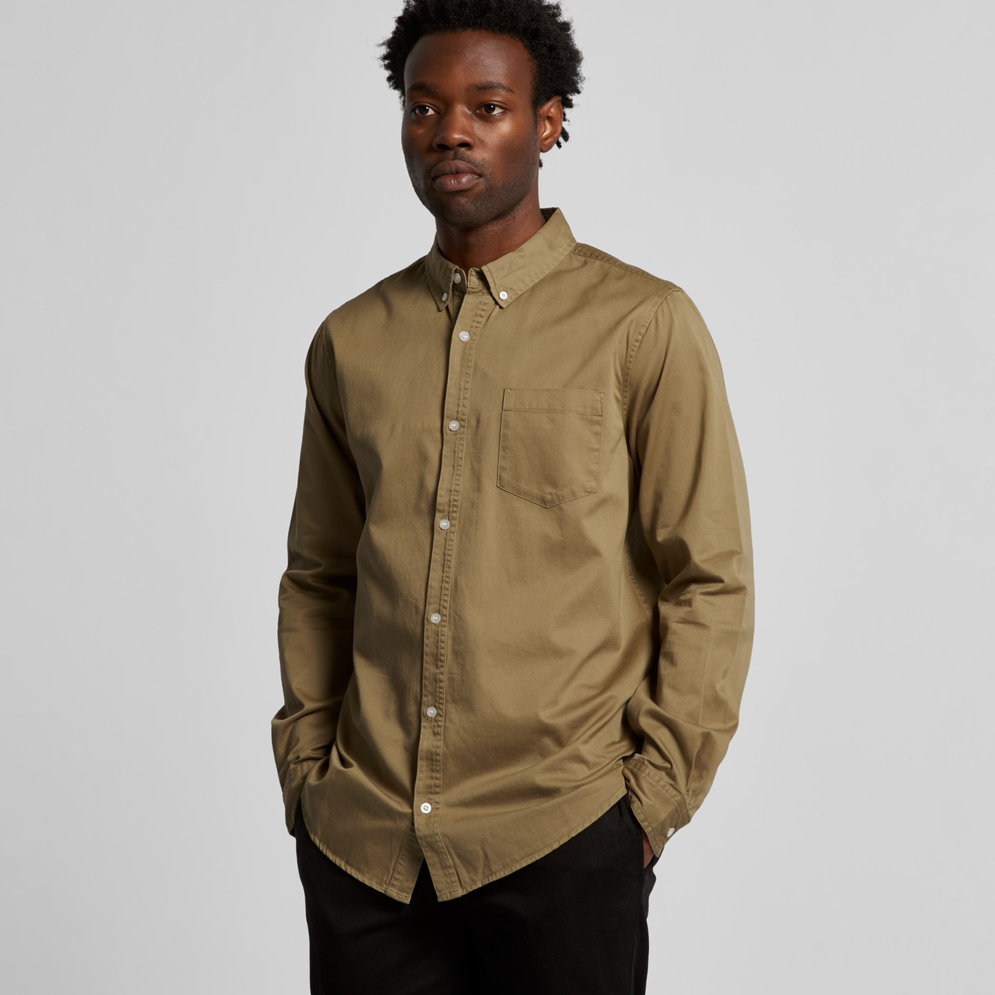 Long sleeve button up shirt, button-down collar, chest pocket, clear buttons, adjustable cuffs