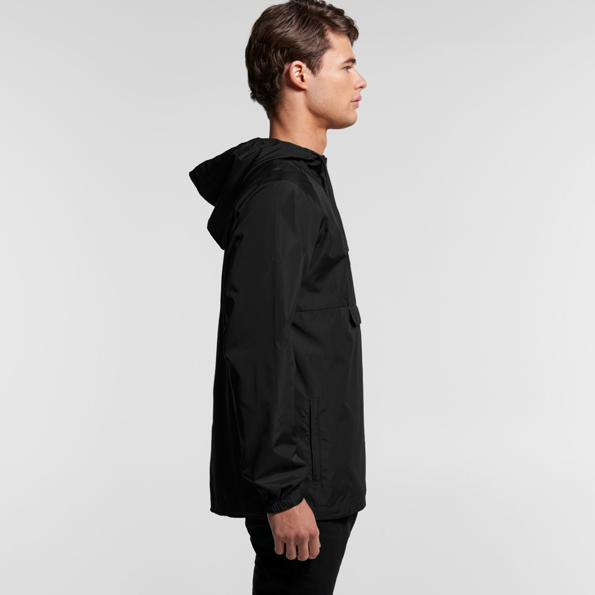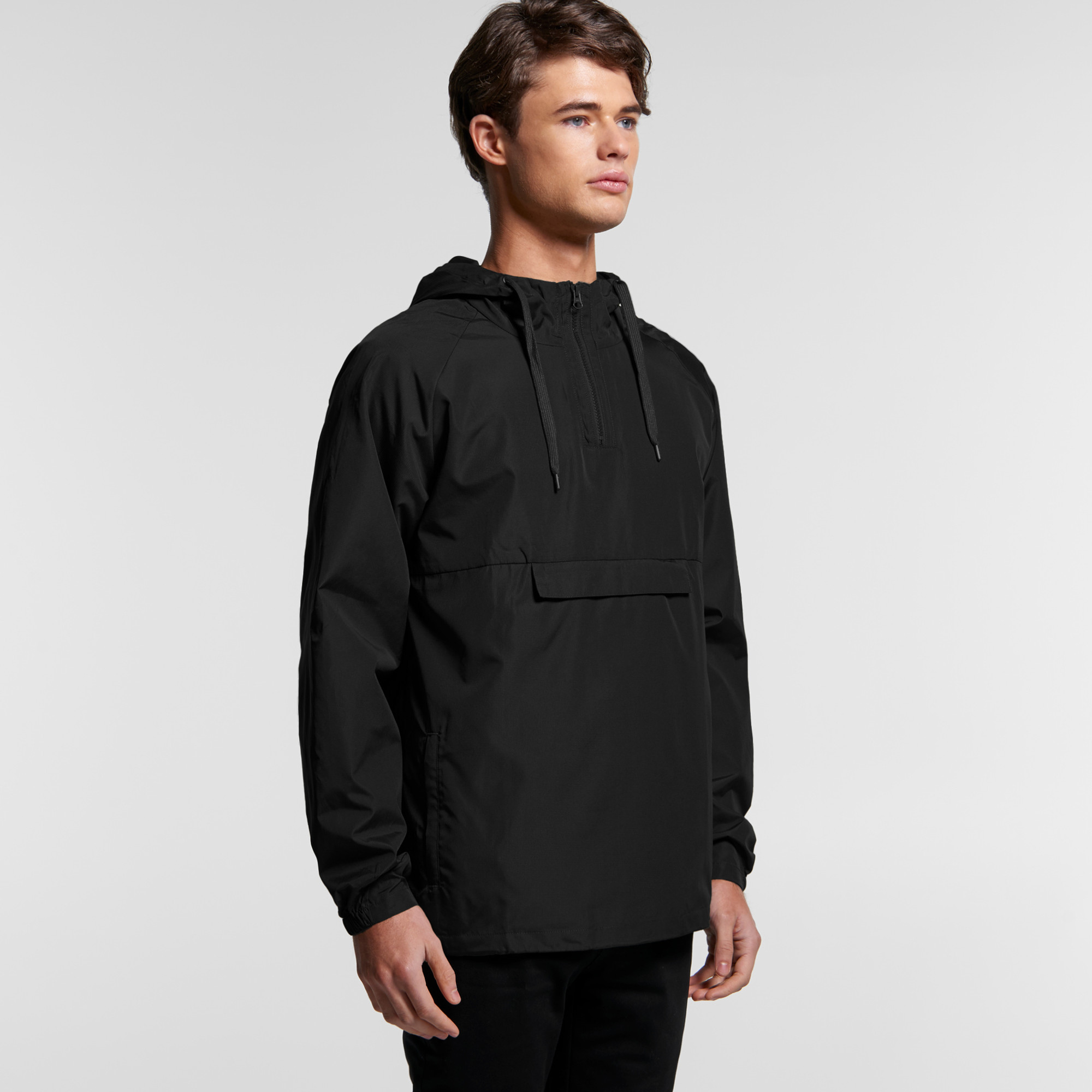 Adjustable elastic drawcords at hem and hood, rubber headphone patch, sealed seams, water resistant, SPF 40, packable