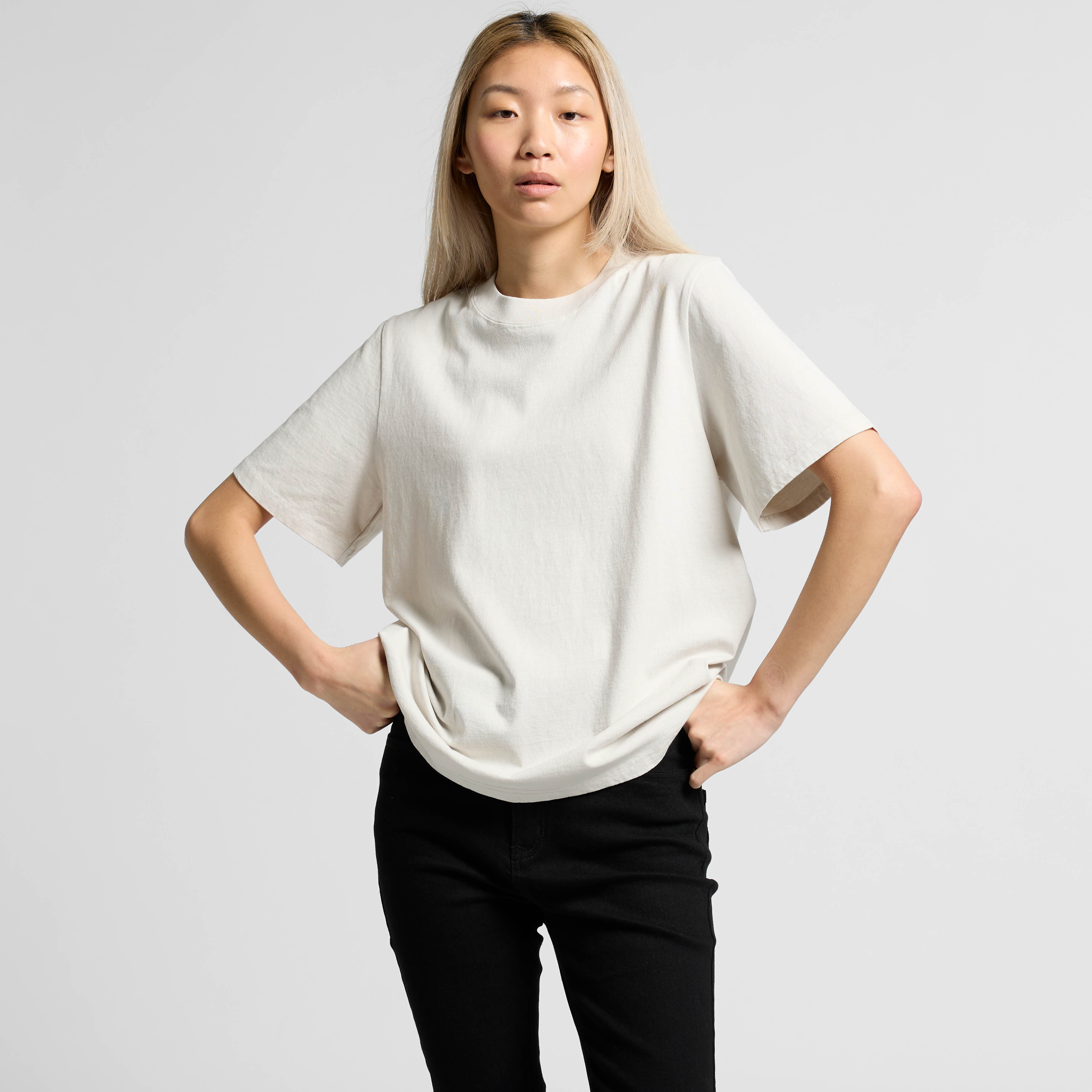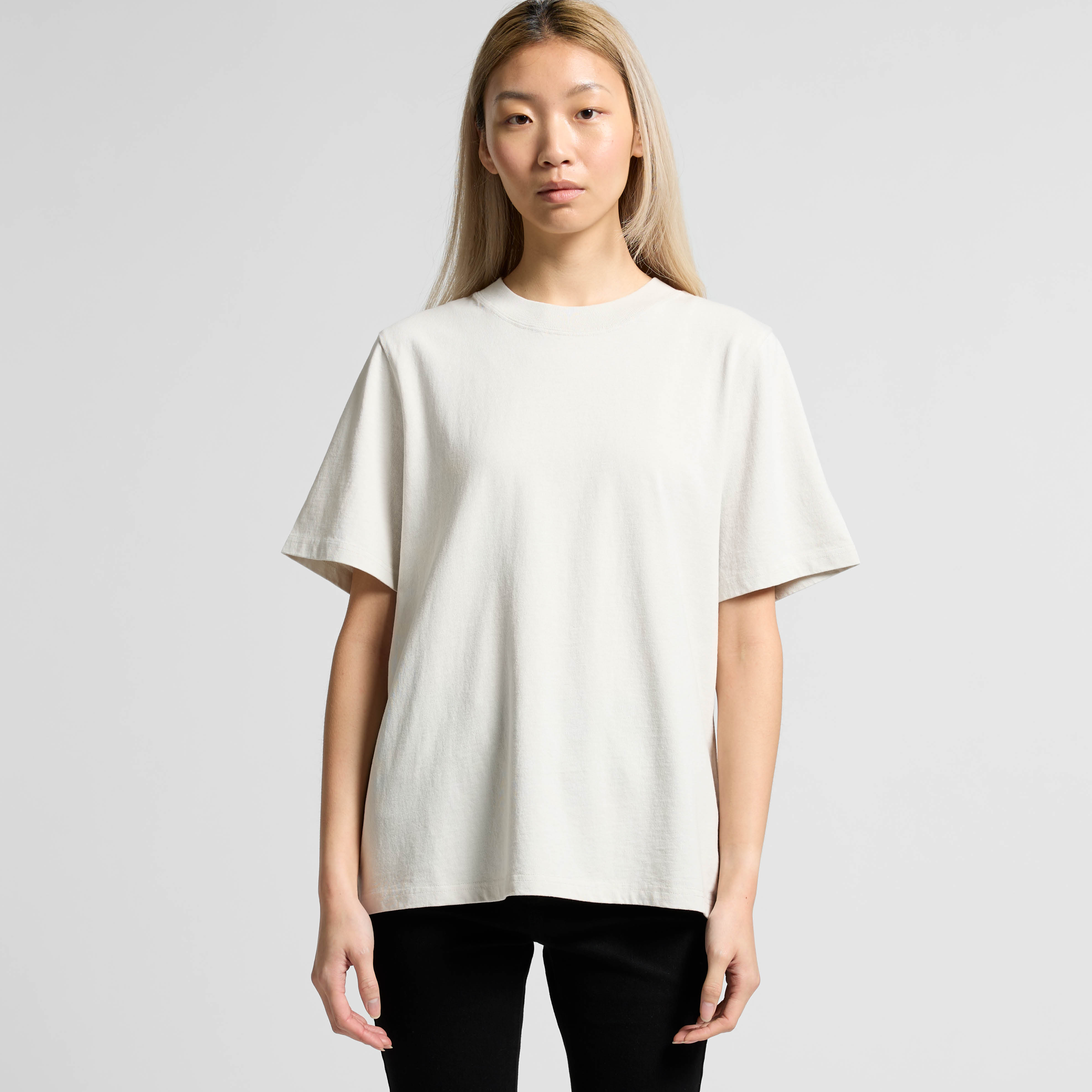 Wide neck ribbing with twin stitching, wide shoulders, raw armholes, side seamed, shoulder to shoulder tape, double needle hems, garment dyed, preshrunk to minimise shrinkage